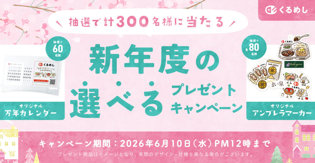 国内最大級の法人向け弁当デリバリーサービス「くるめし弁当」(運営:株式会社くるめし、本社:東京都渋谷区、代表取締役:小林 篤昌)は、LINE公式アカウントの友だち追加で抽選プレゼントが当たる「新年度の選べるプレゼントキャンペーン」を、2026年06月10日(水)まで開催しています。期間中、くるめし弁当のLINE公式アカウントを友だち追加の上、専用フォームから必要事項を記入して応募いただいた方の中から、抽選で合計300名様に「オリジナルアンブレラマーカー」など、くるめしオリジナルノベルティをプレゼントいたします。
